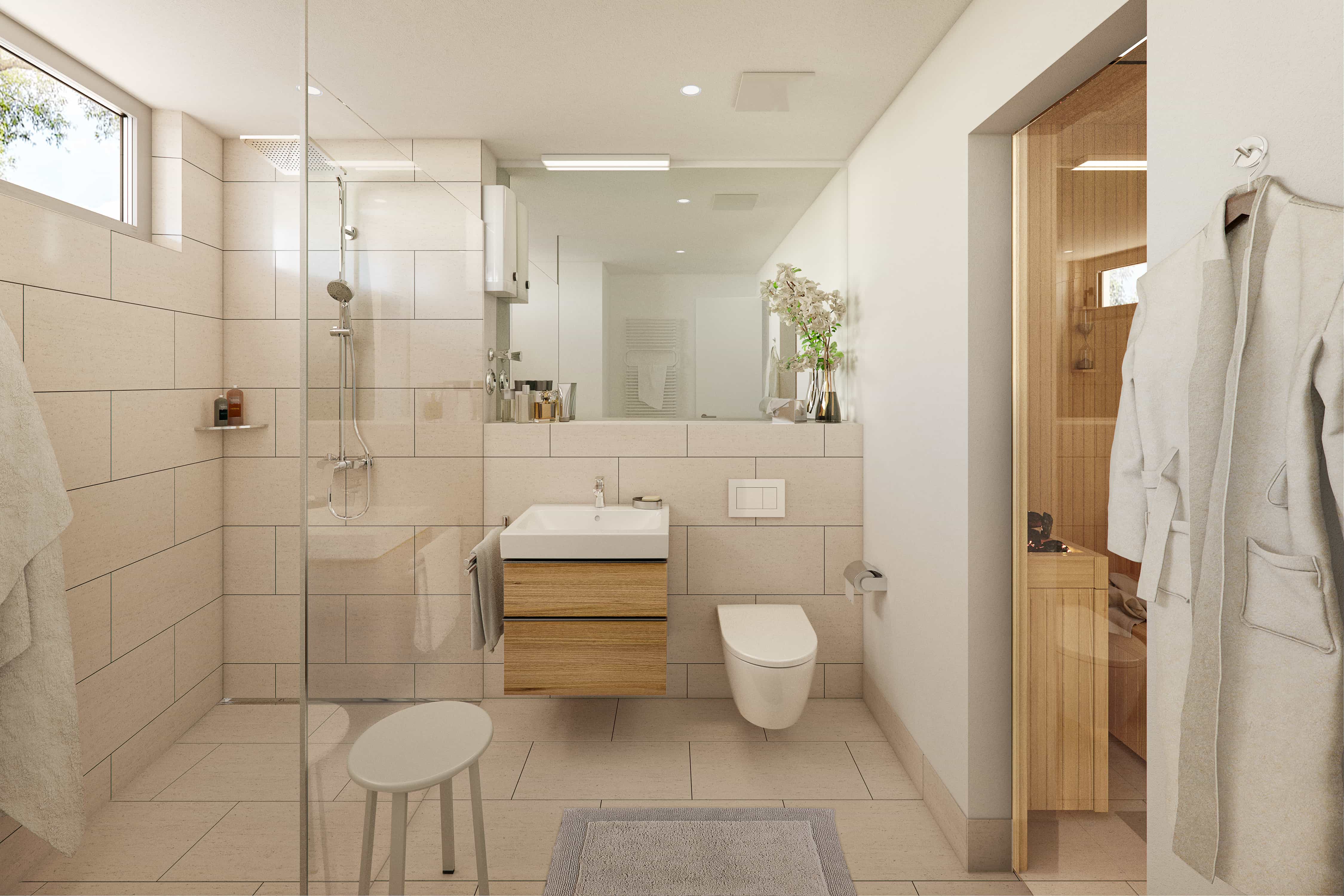 The sauna provides cozy warmth. The spruce or cedar wood installation with glass door and tasteful floor tiles will make you sweat.
