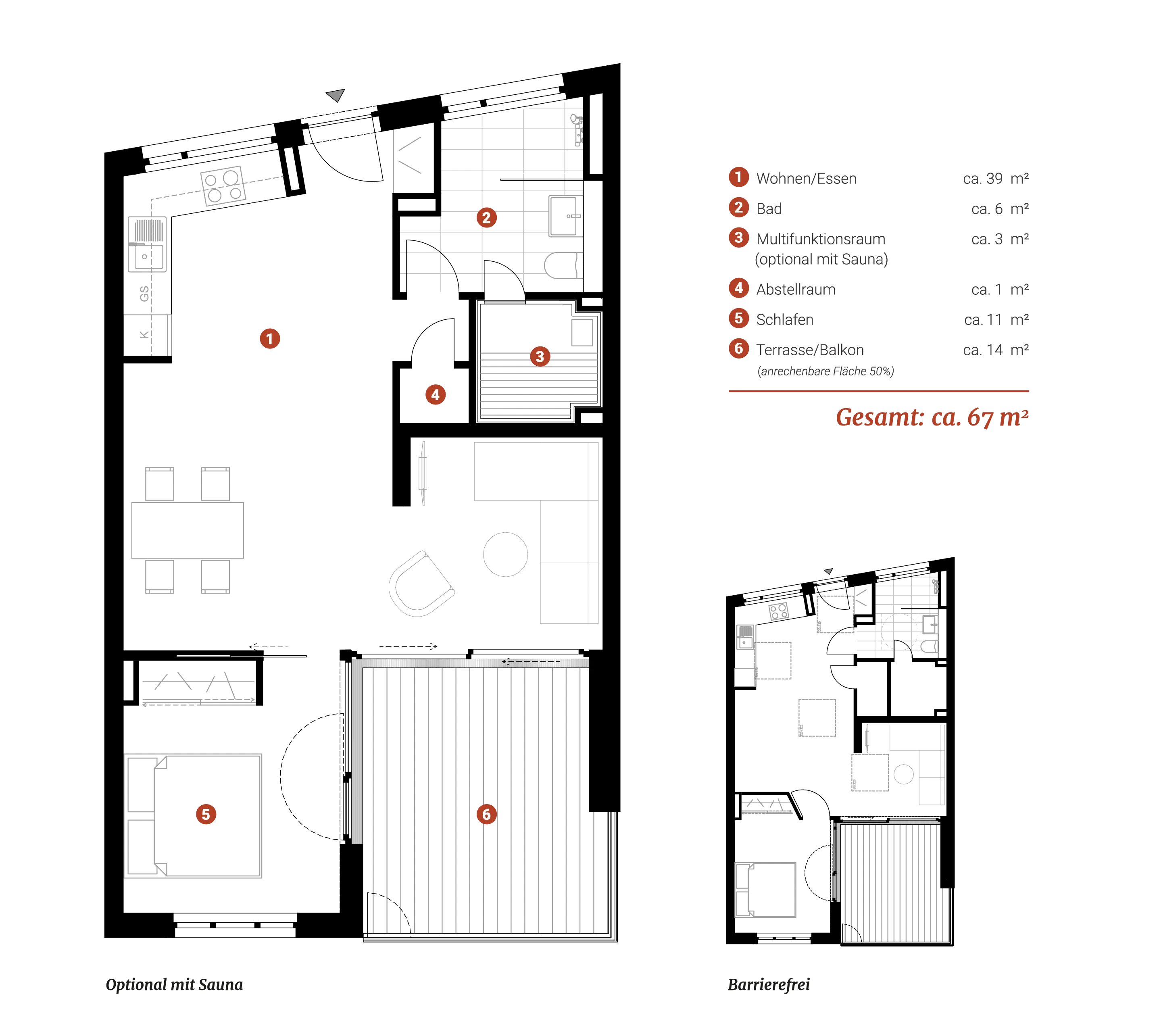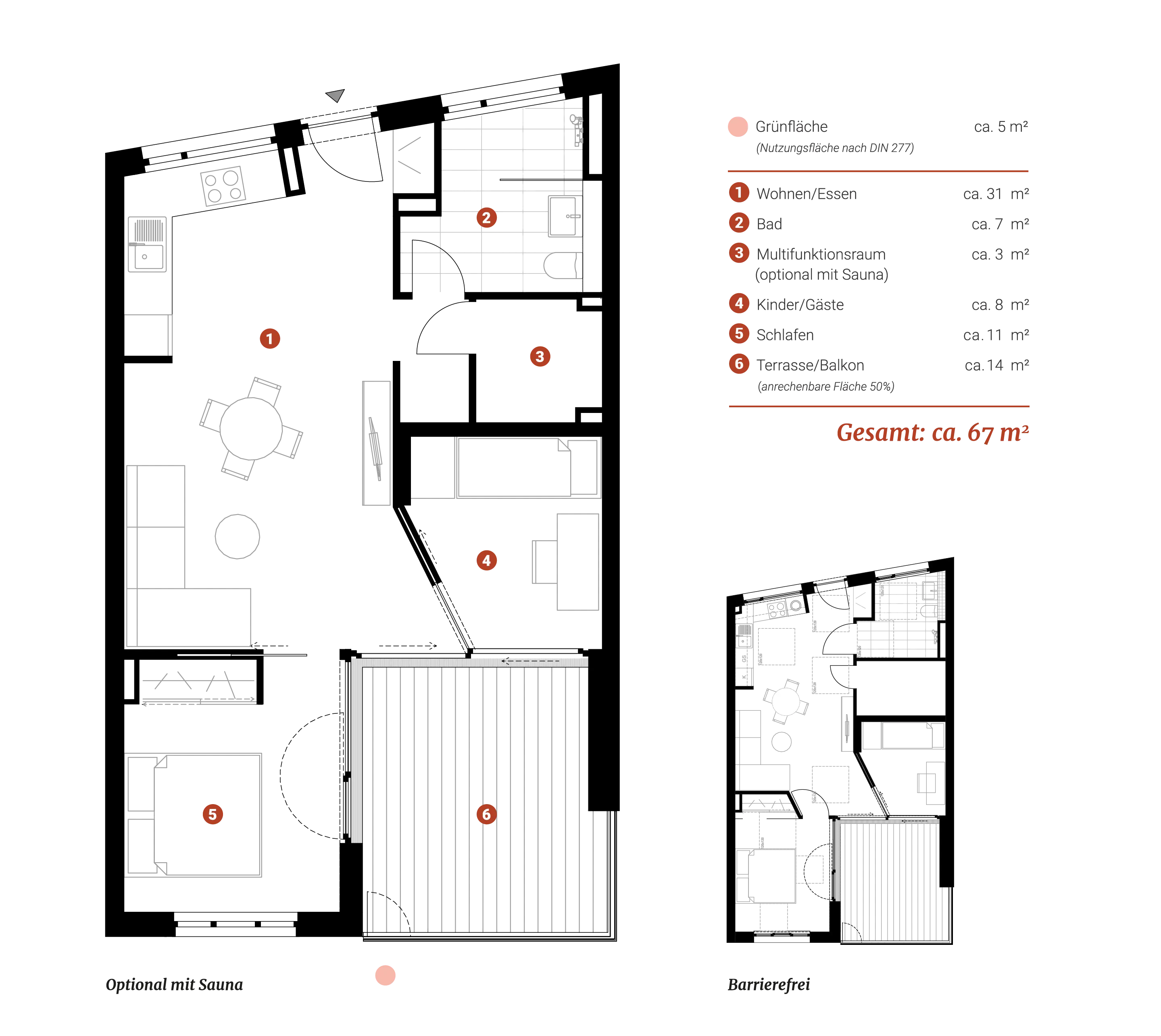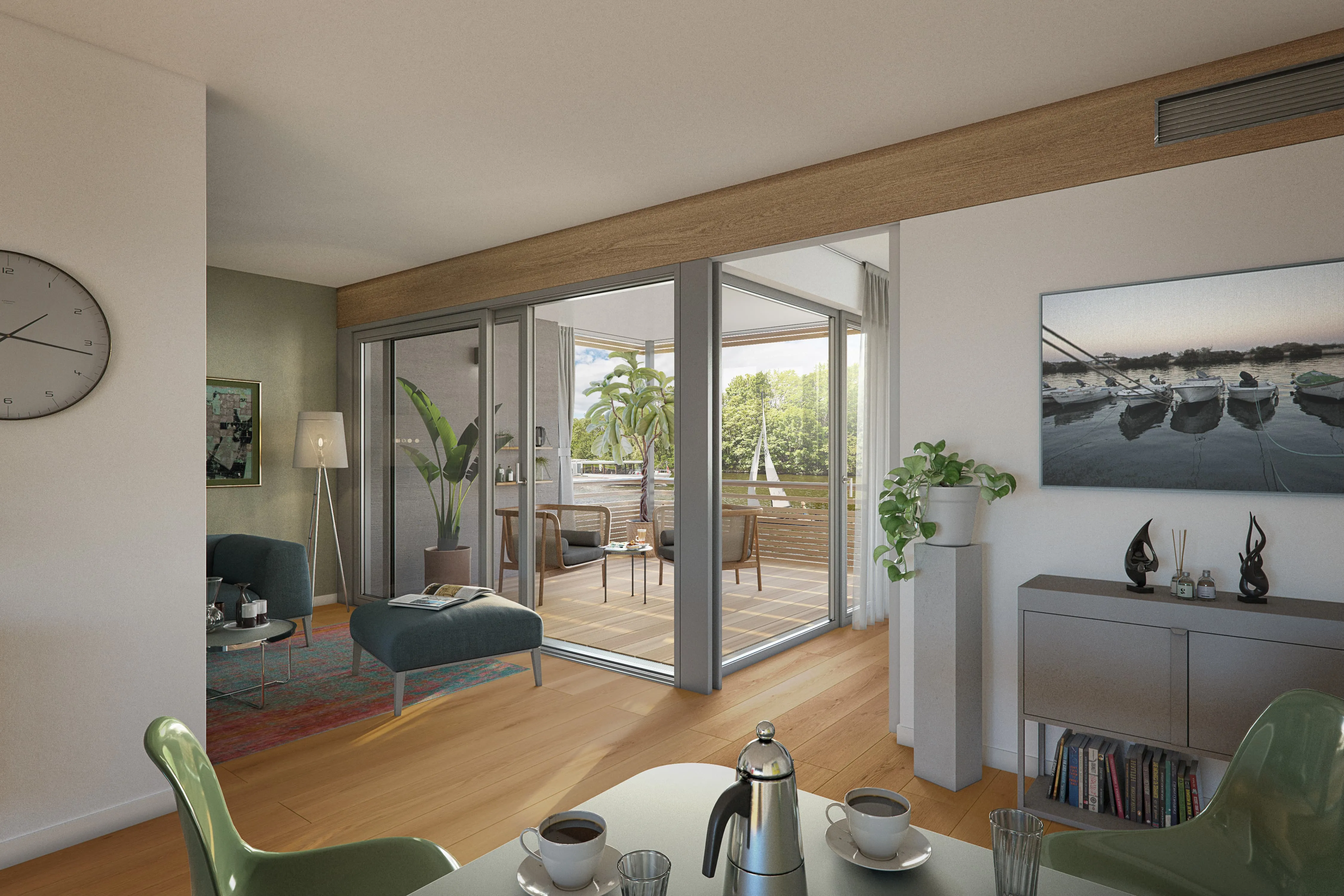 Brigg is a three-room apartment on the first floor with plenty of space: a large living area with an open kitchen and terrace. The apartment is flanked by a small green area with private access to the marina. Further options: Sauna as well as a barrier-free extension.