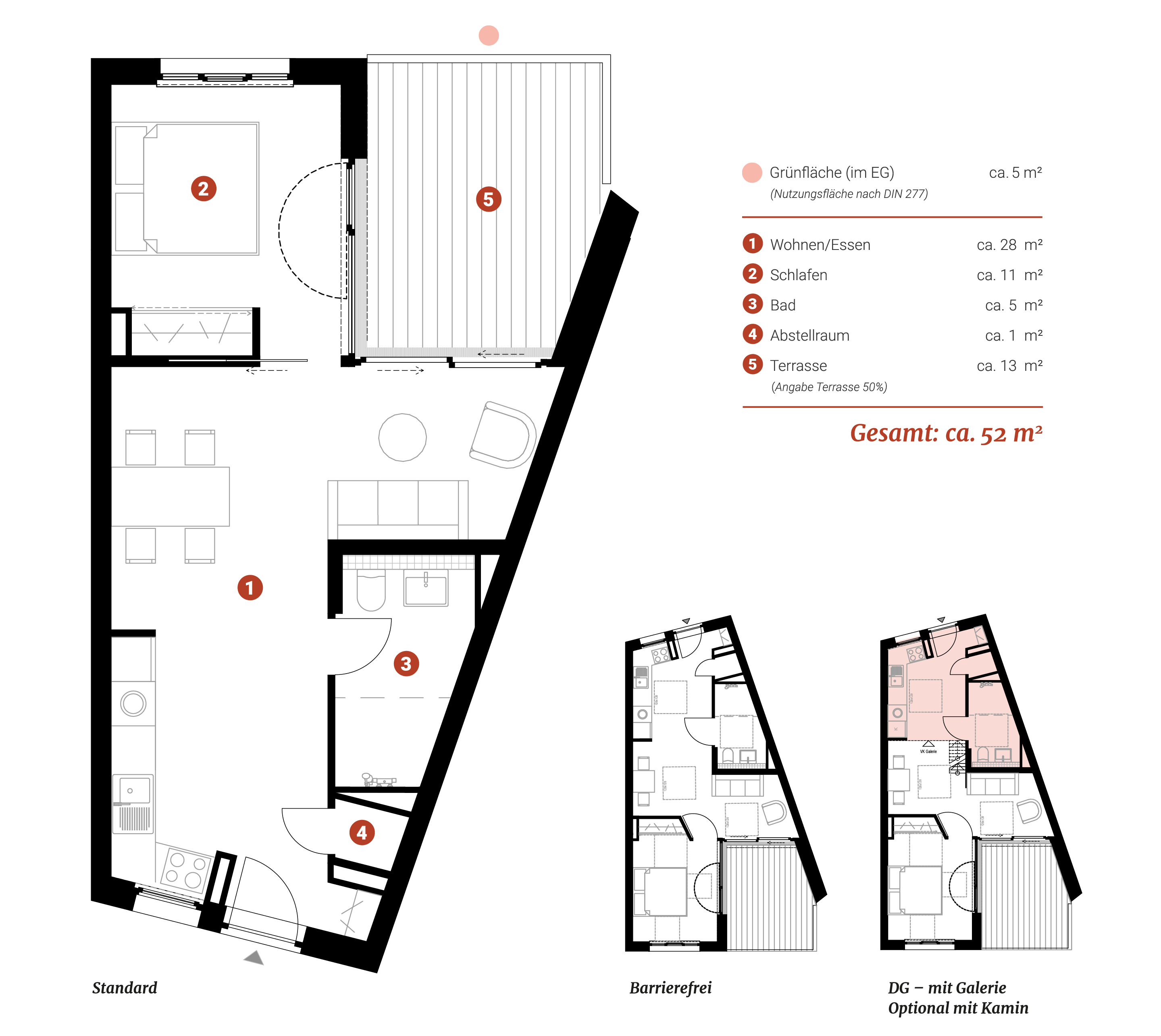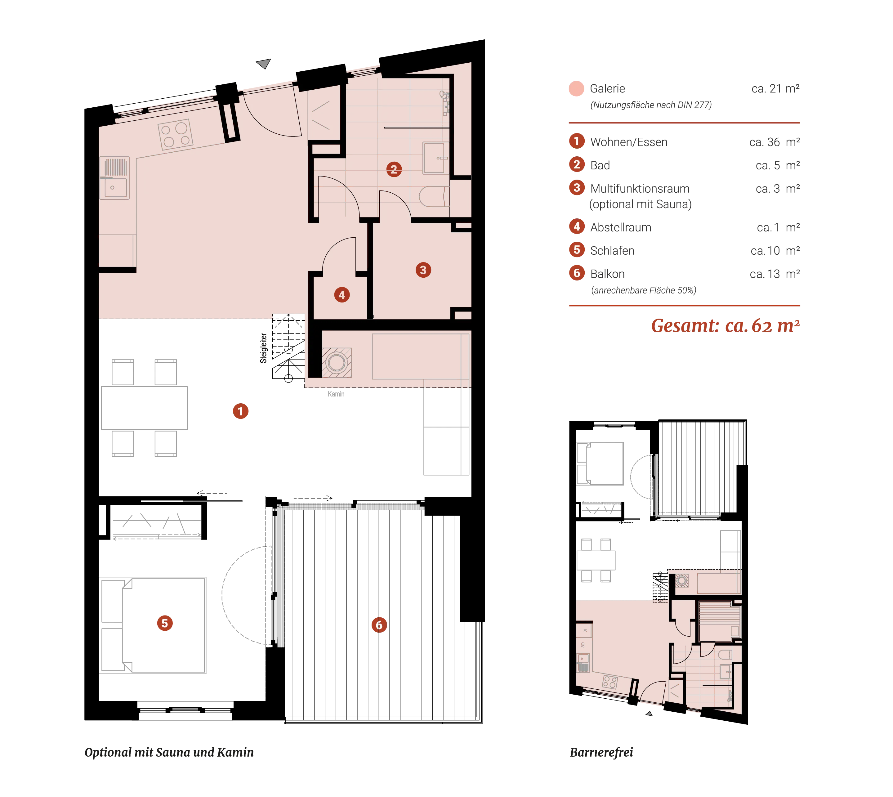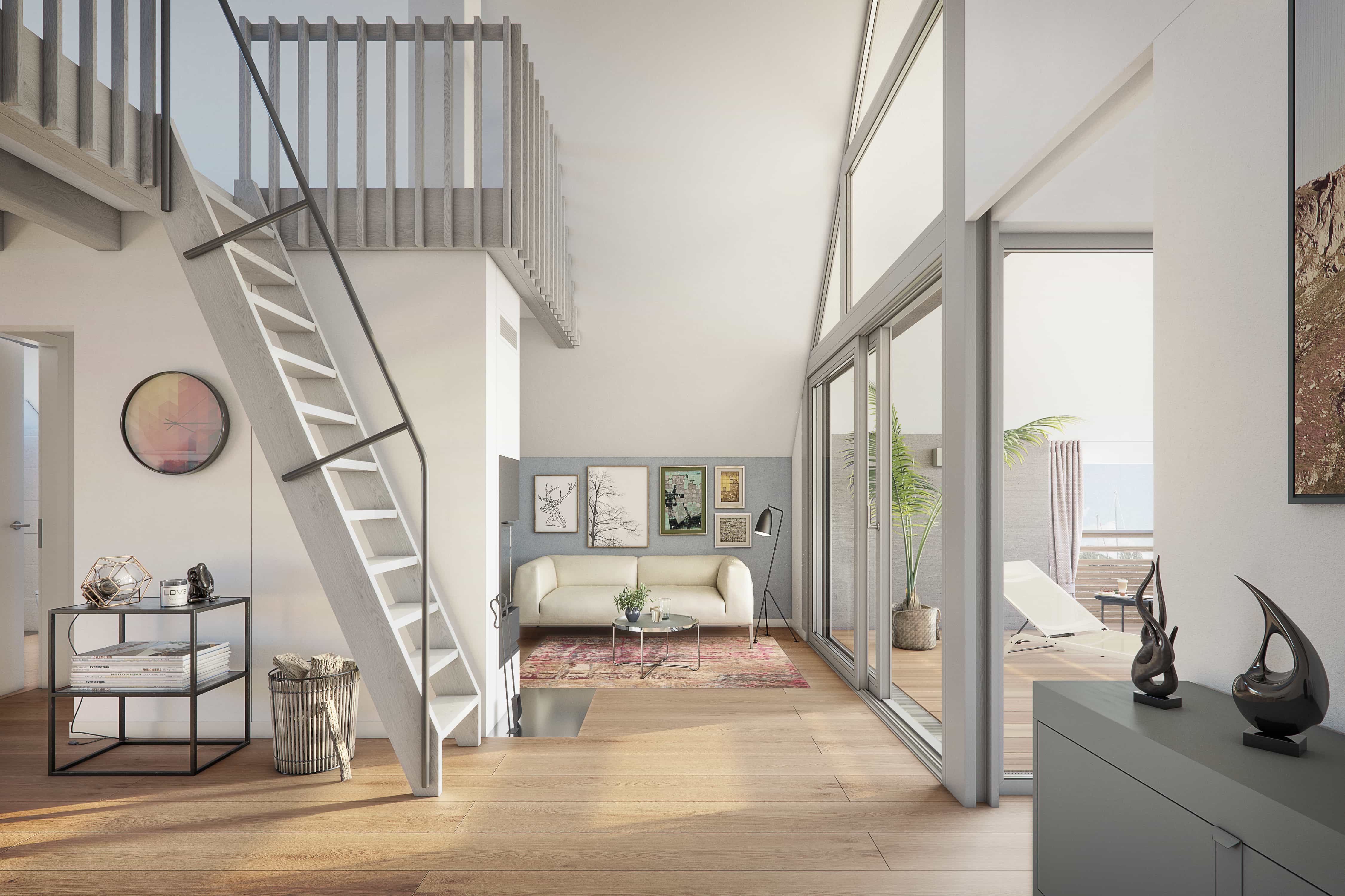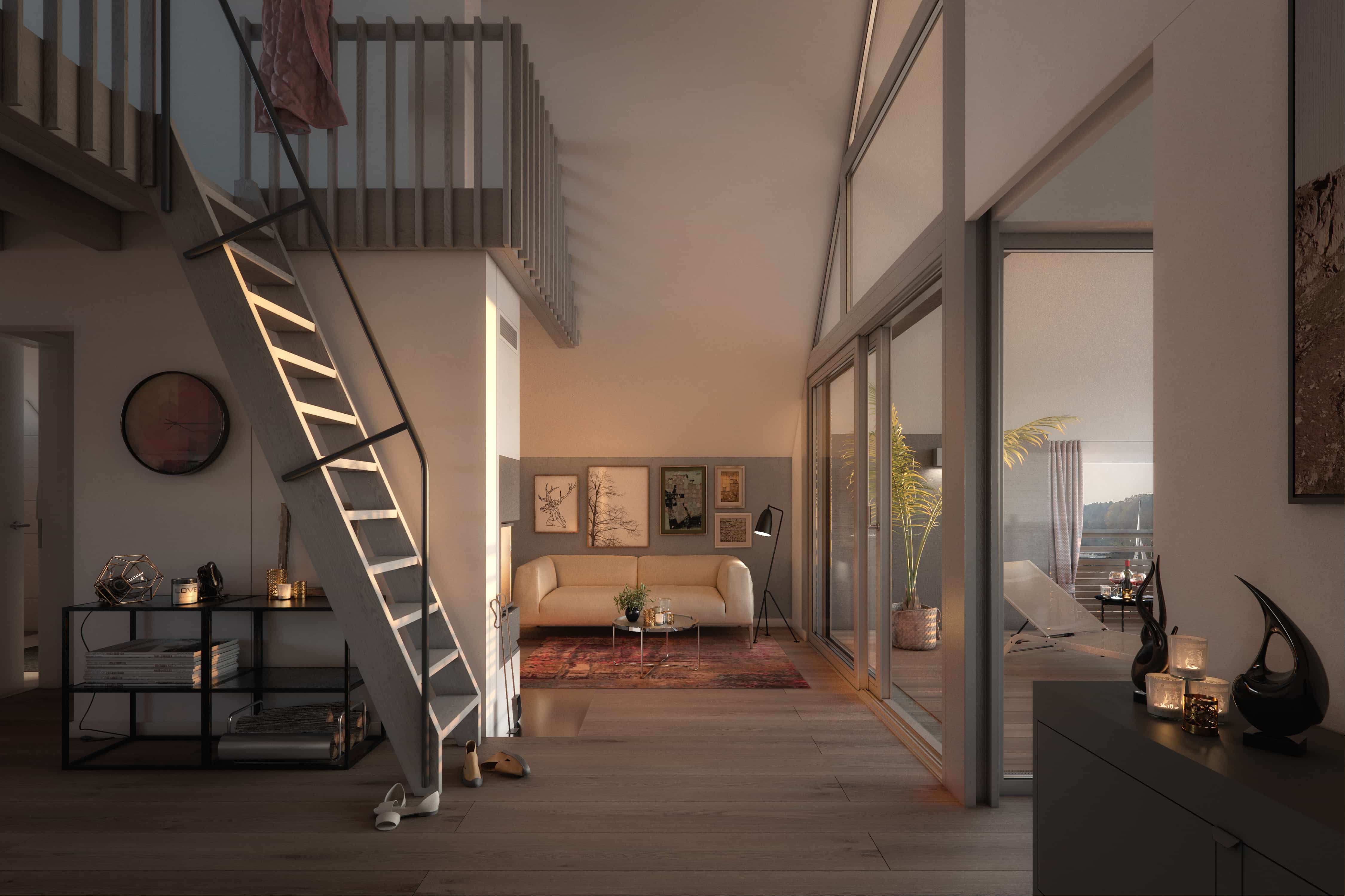 Jolle is a two-room apartment with a gallery on the top floor. The spacious living and dining area is extended to the water through the floor-to-ceiling windows of the terrace. Further options: the installation of a sauna, a fireplace for cooler seasons and a barrier-free extension.