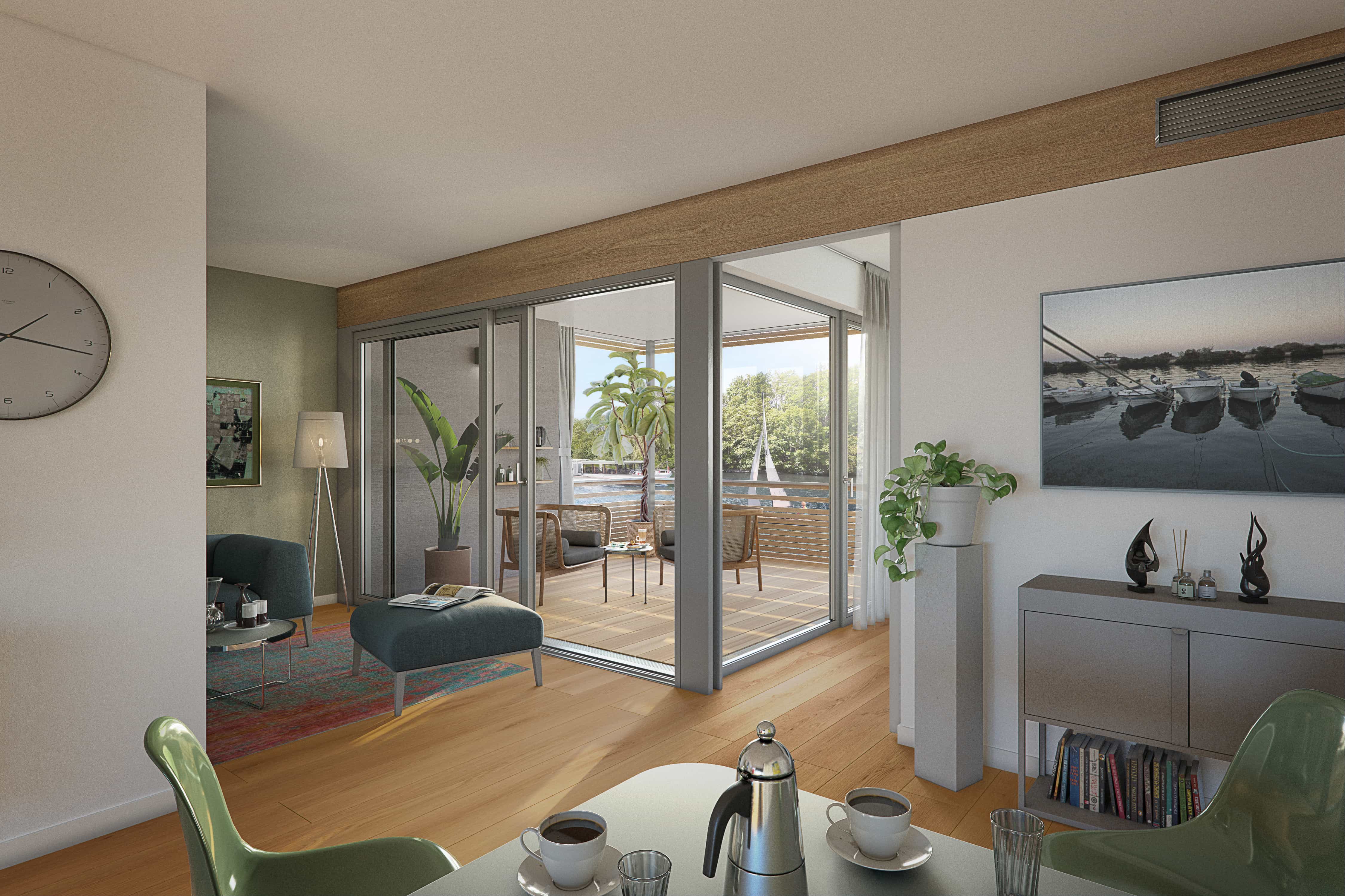 The two-room apartment with open-plan kitchen offers plenty of space to relax - perfect for a time-out for two. On the first floor, the Skiff type is flanked by a small green area with its own access to the marina and can be equipped with a fireplace on request.
