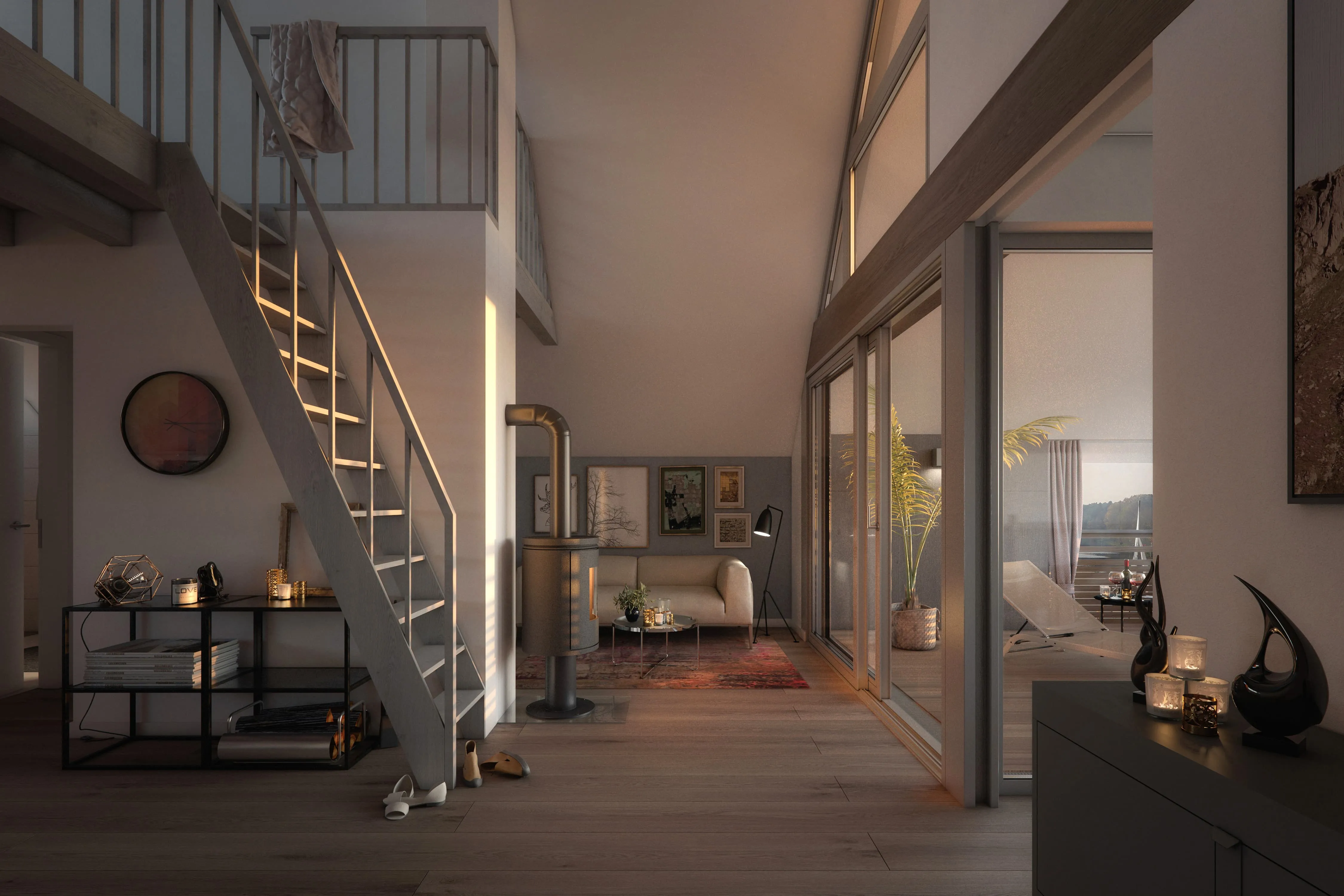 The attic apartments come with a chimney flue for the room-side installation of a free-standing stove.